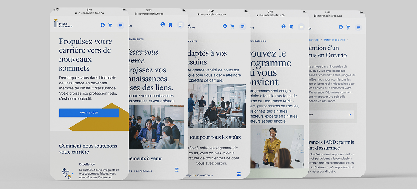 Le nouveau site Web de l'Institut d'assurance vient d'être lancé. Des années de travail acharné ont été consacrées à la refonte de notre présence en ligne. Nous sommes donc très heureux de dévoiler notre nouvelle image à la communauté de l’assurance. La conception visuelle du site est recherchée, mais agréable à l'œil. C'est un site qui fonctionne aussi bien sur les appareils mobiles que sur les ordinateurs de bureau et qui vous apporte rapidement le contenu dont vous avez besoin pour votre avancement professionnel.